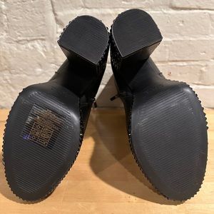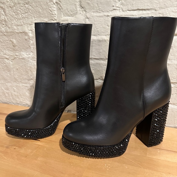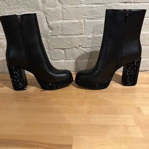 Black booties with hand rhinestoned heels. Size 8. Worn twice. Approx a 4 inch heel. Pet free smoke free home.
