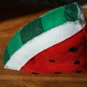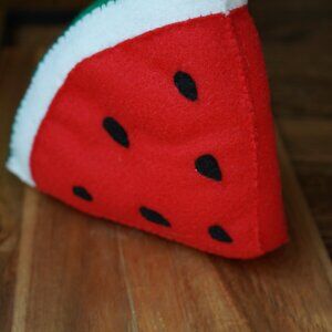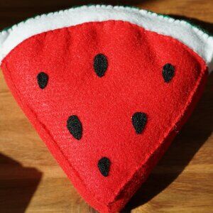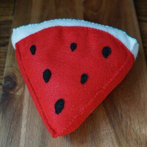 This hand-sewn felt watermelon slice is perfect for pretend play, kitchen sets, or as a fun decorative piece. Each one is carefully stitched with love and attention to detail.