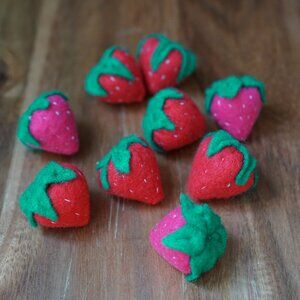 This hand-sewn felt strawberry set includes 5 berries, perfect for pretend play, play kitchens, or imaginative fruit markets. Each berry is carefully stitched by hand and comes in two charming colors: red or pink.