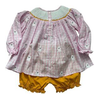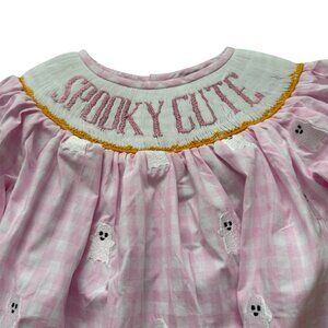 This hand-smocked two-piece outfit features long sleeves and an embroidered ghost pattern on a soft pink and white gingham cotton fabric. Designed with buttons in the back for easy dressing, it offers a charming spooky-cute look perfect for the season. Matching bubble outfits for sisters and brothers are also available, making it ideal for coordinated family photos or festive gatherings. Crafted from 100% cotton, it ensures comfort and breathability for your little one.