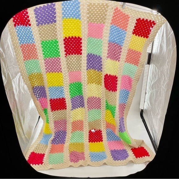 Hand Stitched Granny Square Boho Star wool Crochet Blanket in Bright Colors. Used this for my daughters room for a few years. In good condition. There is one flaw and pictured in the last photo.