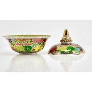 Hand Thai Painted Gold Tone Pottery BENJARONG Porcelain Cup & Lid Cloisonné 4.5"