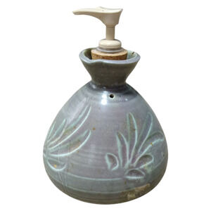 Handcrafted ceramic soap dispenser with a rustic farmhouse charm. Featuring a soft blue-gray glaze and carved leaf motif, this piece adds artisanal elegance to any kitchen or bath. Designed with a sturdy pump and wide base for stability, it pairs perfectly with farmhouse sinks, shiplap walls, and wood counters. A functional yet decorative accent that brings timeless style and handmade character to your space.