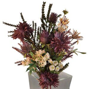 • Includes 10 steam of dark purple mums, thistles, cream daisies, burgundy and greens