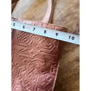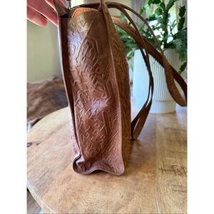 Genuine leather hand-tooled tote bag with an embossed boho tribal pattern. Made in India. Soft and supple leather with a full fabric lining, top zipper closure, inner zip pocket, and comfortable shoulder straps. The bag looks barely used — leather is soft, rich, and beautifully conditioned. No marks, stains, or damage. Please see photos for details. Ships next business day