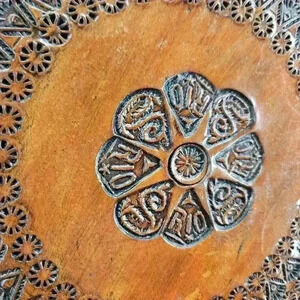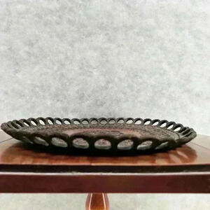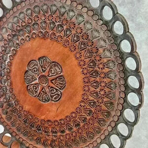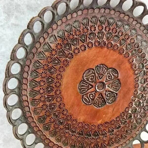 What a neat vintage find! This is a hand tooled leather tray from Rio D Janeiro, Brazil. The round tray has open scalloped edges and rows of alternating patterns stamped into the tray. In the center, their is a flower shaped pattern with "Rio" stamped inside. The tray is in great vintage condition. It measures 9" in diameter and stands 1" tall.