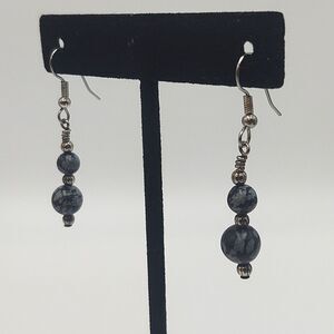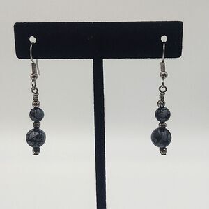 These earring feature graduated snowflake obsidian beads hand wired with silver tone accent beads hung from fishhook wires.