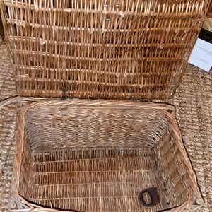 This large woven willow beauty is not quite perfect, the lid has/ had a short leather strap that attached to the original small metal toggle on the front acting as a lock, but the small leather strap broke. It's no problem, as the lid of the basket does not open when the handles are up in carry mode, so the small leather strap was an extra lock, & can easily be replaced.