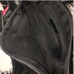 Pink and black stripped hand/shoulder bag with phone holder on the front. It's light weight and had had lots of room. In good condition hardly been used