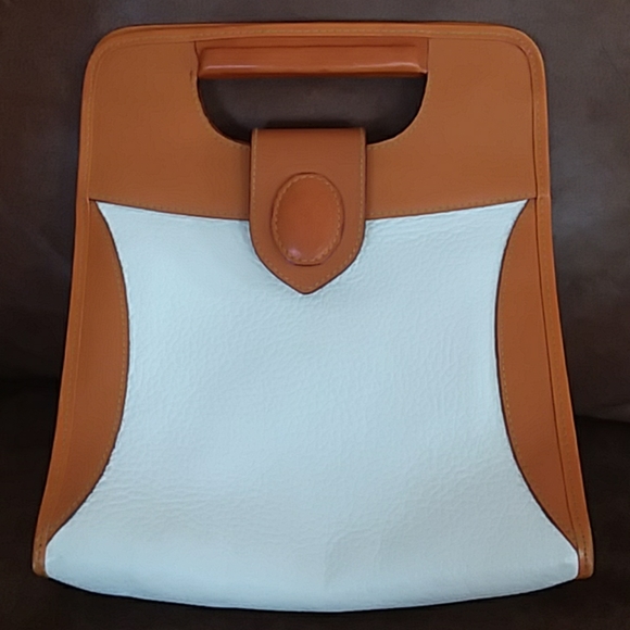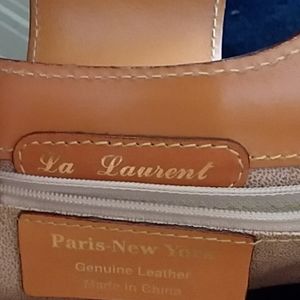 La Laurent hand bag with shoulder strap. Never used. White with tan leather trim. Out side pocket on back side. One zipper pocket and one open pocket on inside.