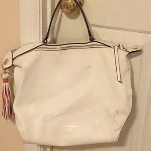 White hand bag from Express NYC. Two compartments both close with zippers. Gold zippers and tassel to accent bag. Has some marks on the front and back of bag.