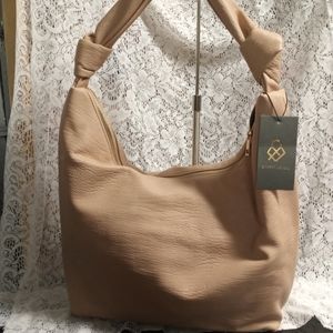 Leather Tan Arm purse double knot design made into the strap giving it a sleek look, gold zipper closure inside of the side walls one side has twin pockets the other wall has one large pocket 15H x 14L x 4W