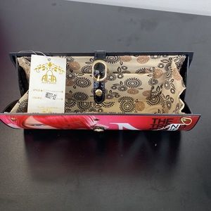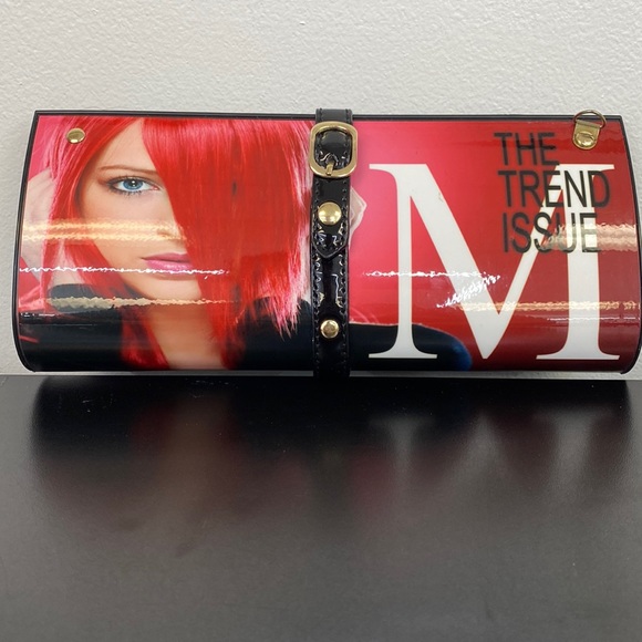 Handbag, pink, reddish background woman on it says “ the trend issue”
