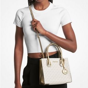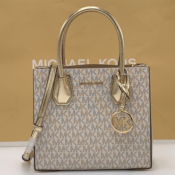gold and white Michael Kors mini two purpose bag. It can be carried as a handbag or as a cross body