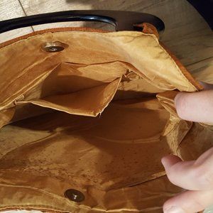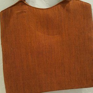 Brand new, never used. Deep rust color with delicate hand beading on the front. Back is solid fabric. Features two wooden handles. Lined inside with a single pocket.