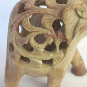 Hand carved soapstone mother elephant with baby. Small baby elephant is hand carved inside of mother elephant. Measures approximately three and a quarter inches tall by 3 and 1/2 in wide.