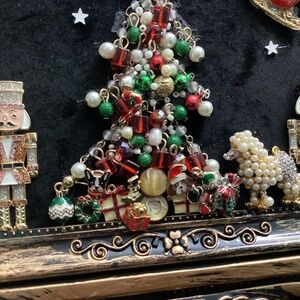 This display for Christmas. It’s in a standup frame and is adorned with up cycled vintage jewelry from earrings, bracelets and brooches. It has a poodle and if you look closely under the tree, it has two other furry friend heads that used to be earrings. Under the tree is lots of packages that used to hang from a charm bracelet. The nutcrackers were once articulating earrings that had been damaged. In the top right corner you’ll see a very old vintage sleigh and Santa is sitting on top with a little white reindeer. Study the Christmas tree carefully you’re going to find shiny balls and pearls Christmas presents and ornaments. The tree is topped with a wooden star with a tiny repurposed earring in the center. This is going to be a one of a kind Christmas display. If you have someone that’s hard to buy for this might be the perfect gift!