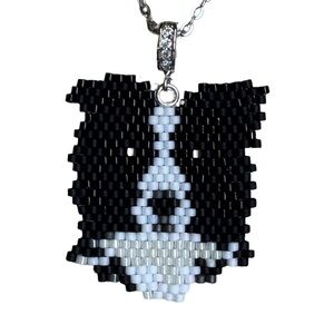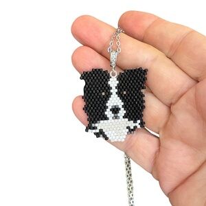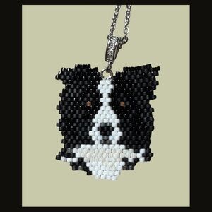 This handsome Border Collie face was handwoven using brick stitch and high-quality Miyuki delica glass beads. the pendant itself measures approximately 1.4” tall and 1.3” wide. It is attached to a decorated bale and hangs from an 18” chain The necklace positively glistens in the light. Be sure to view the video to see that.