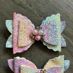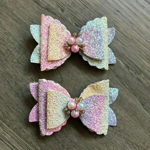 Hand crafted layered rainbow unicorn glitter sparkle hair bows with pearls
