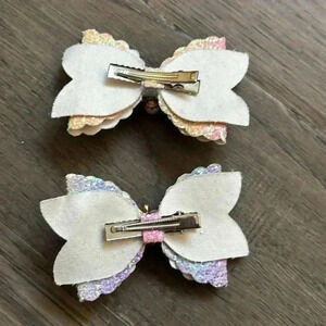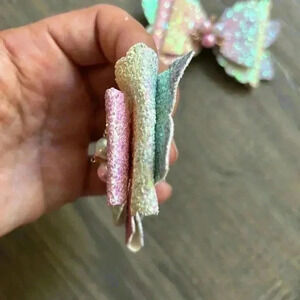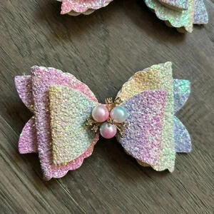 These hair bows are absolutely adorable. They’re a rainbow unicorn 3 layered bow with a pearl embellishment in the middle. I do crafts at Christmas time for the little ones and make a bunch and sell them. Have a lot more and if there’s a certain hair bow you’d like let me know. Can make different ones.