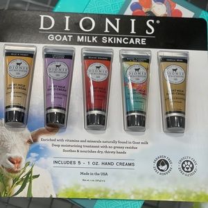 Dionis Goat Milk Skincare Set Including 5 - 1 oz. Hand Cream Hand Included: Fragrance Goat Milk & Honey. Lavender Blossom. Blood Orange. Water Flowers & Sea Salt and Vanilla Bean.