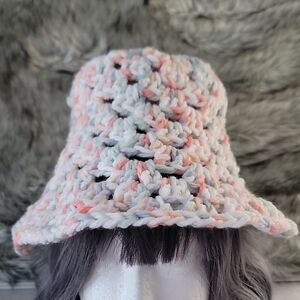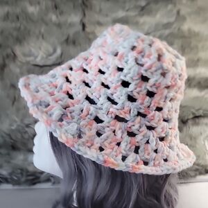 Stay stylish with this crochet granny square bucket hat. Featuring a blend of soft pastel colors, it's perfect for adding a pop of color to any outfit.