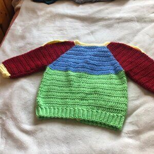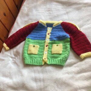Hand crocheted button down sweater for child with American Girl Flowered purse