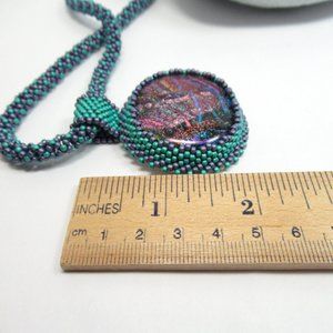 This listing is for the hand bead embroidered Dichroic pendant and matching handwoven necklace pictured. The chenille stitch woven necklace is 18 inch plus the pendant size. It is made with permanent finish Toho brand glass beads in teal and purple and has a handwoven loop and toggle. The pendant was embroidered by me using a beautiful layered Dichroic cabochon surrounded by seed beads and backed with nice white leather. This piece was crafted by me using quality materials and love. It is part of my personal collection of jewelry I made for myself over the years and never wore. It is in good unworn condition.