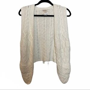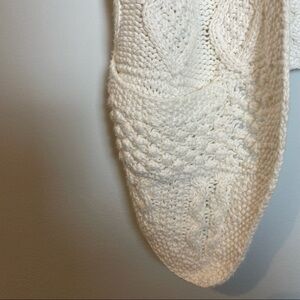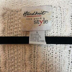 Hand knit New York Style 5 front button front vest with tie in the back. A perfect knit for the summers trendy looks that can be worn alone with shorts or jeans etc. or styled with a bralette or a button down shirt or cami underneath. Preowned and in Good condition it has a vintage but 2022 trendy feel about it. Size Small measurements are ( with vest laying flat and buttoned ) pit to pit 17 1/2” length front 26” / back 19 1/2” . Perfect garment that can be used and styled year round! Color is an oatmeal type color.(B105)