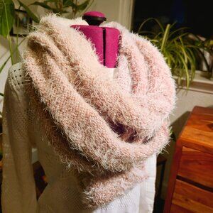 This comfy scarf is soft to the touch, perfect for bundling up. Made up of a blend of 58% acrylic and 42% nylon. It is 114 inches by 8 inches.