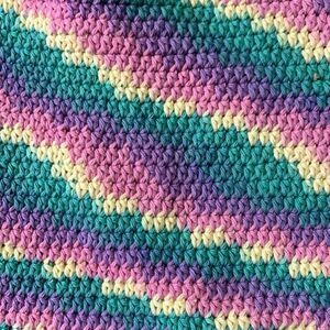 Handmade knit hobo purse, colorful pastel colors. Cute bow that is sewn in place. Sits on shoulder. All open inside. Never used. No flaws found