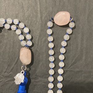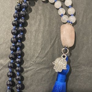 108 blue sandstone and rose quartz beads with rose quarts stone and hamsa 🪬 charm and tassel.