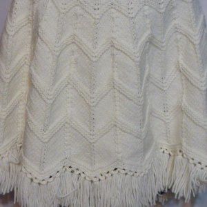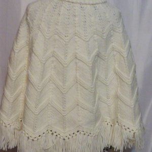 This is a Handknitted poncho. Knitted to fit all sizes. Winter white hand knitted poncho, front buttoned with a collar to keep you warm and styled with tassel fringes /