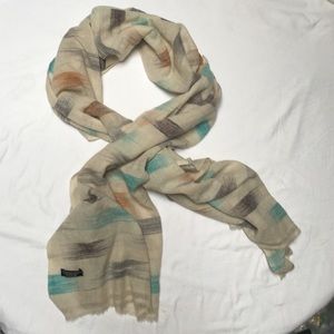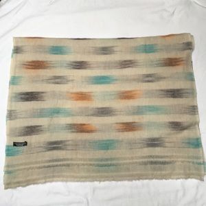 Never worn. Hand Made, 100% exclusive Cashmere. One of a kind, made in Nepal. Colors are beige with orange, turquoise, black, gray and a little brown through it.