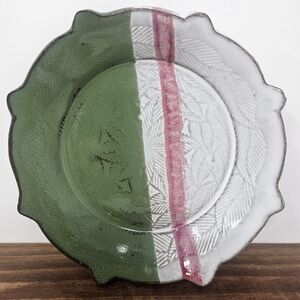 This is a hand made 7 inch glazed clay plate with a multicolor design. It is a decorative plate from the brand JK, perfect for serving or displaying food. Made from clay, this plate adds a touch of artisanal charm to any table setting.