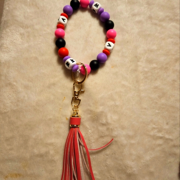 hand crafted Keychain. pink, purple, and black beads, says mama