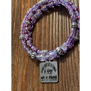 Various shades of purple beaded bracelet made from memory wire and a laser engraved charm that says One day at a time then underneath it has the same phrase in sign language. All charms and bracelets interchangeable in my shop