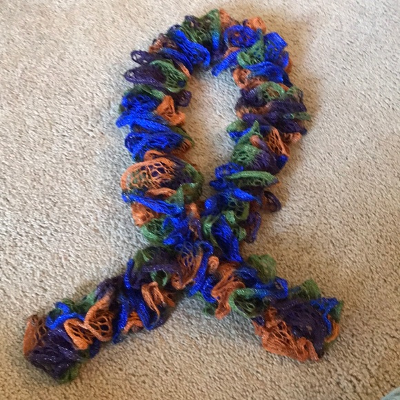 Hand made ruffle scarf, measuring approximately 4 feet long. Great fall or hallowing colors ranging from a vivid blue to pumpkin orange to sage green and a deep maroon purple. Be sure to bundle with other items in my closet for max savings!!!