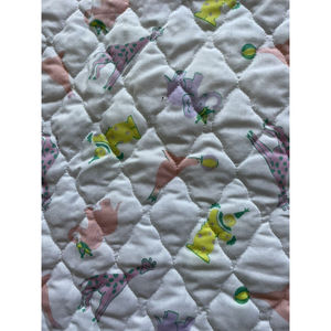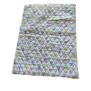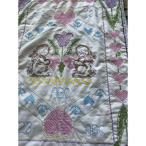 Hand made baby quilt or wall hanging 26x33. This adorable baby quilt would also make a cute nursery wall hanging. It is hand embroidered in a sampler type pattern in multi-colored pastels. In excellent preowned condition. Measures 26x33 inches.