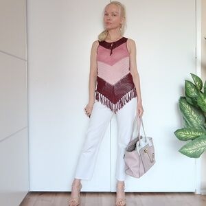 Unique, one of the kind hand made crochet sleeveless pink and cherry color top with the fringe.