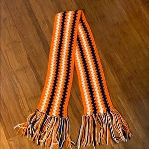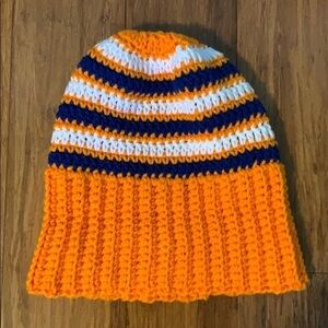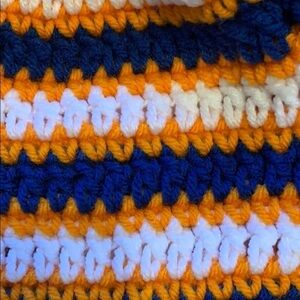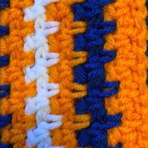 Both the hat and the scarf were handmade using orange, white, and blue yarn.