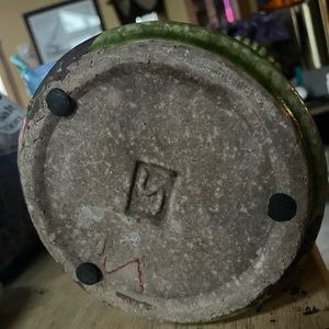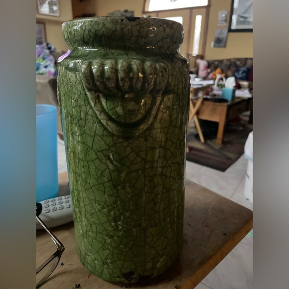 beautiful hand made vase very heavy. Green in color it’s finish is a crackle effect.