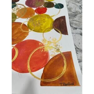 12x9 inches is the perfect size for dorm room, office wall, reading nook, bedroom, living room, kitchen, or even inside a school locker. Featuring shades of various earth tones, like mauve, orange, gold, deep slate blue, green, and brown, and accent with waves of gold, this abstract painting gives off a calming meditative vibe. It can be paired perfectly with a coordinating circles abstract listed separately.