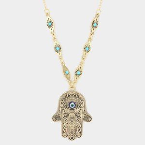 Guard against negativity with our Evil Eye Hamsa Hand of Fatima Pendant Necklace! Crafted for everyday elegance, this stunning necklace features intricate detailing and a protective design. Embrace style and security effortlessly with this timeless piece. Add a touch of mystique to your ensemble and shop now.