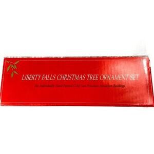 Hand-painted buildings representing Liberty Falls Colorado, as a 1850 mining community. Buildings are all about 1 7/8" tall and wide. Porcelain ornament with gold thread hangers. Pre-owned in great condition- no chips or cracks. Please note, hand crafted items may have dimples, roughs and/or fine scratches.