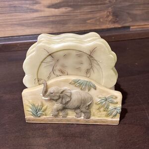 Elephant head coasters with a cork bottom painted with elephant face, holder has a momma on one side and a baby on the other with foliage