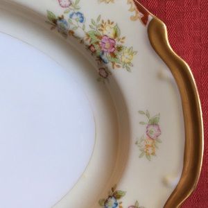 Hand painted red edge w/gold rim, flowers on cream band featuring one larger floral spray. Gold handles. 14”L x 10 1/4”H. Empress pattern EMP10. Japan, possibly circa 1920’s. Some fading, please check photos carefully.