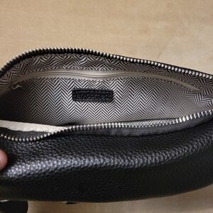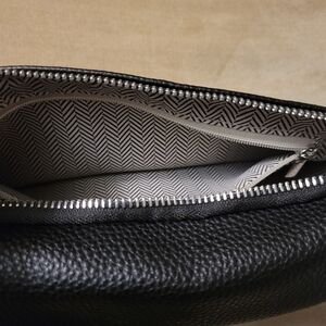 Fabric is a polyester blend, inside print is a cute hounds tooth black and white textile. The bag has two zipper pockets in the front and back has a long zip to main compartment. Within this compartment is a small zipper pocket.