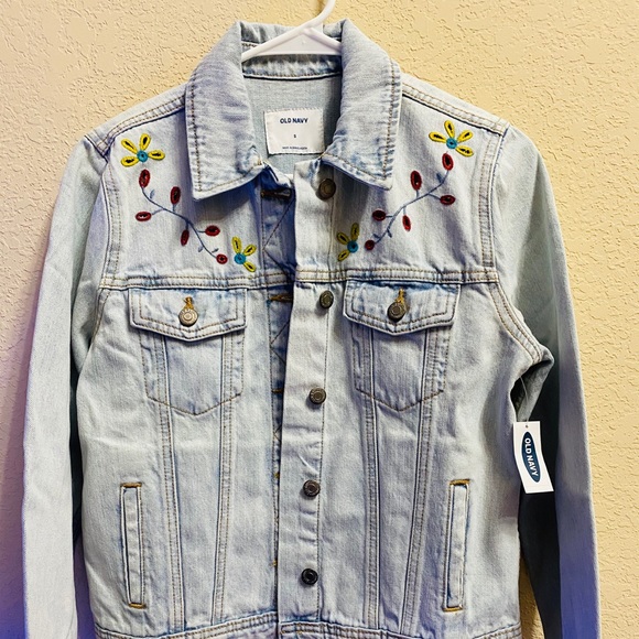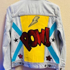 Light blue embroidery Jean jacket hand painted with patches. New size s