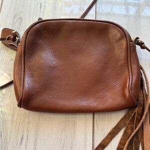 The exterior color is a beautiful brown, with silver hardware accents and a brown leather handle/strap. The interior lining is also brown and made from fabric. The bag features a zip closure to keep your items safe and secure. This Isanti crossbody bag is a unique and stylish addition to any wardrobe, sure to make a statement.